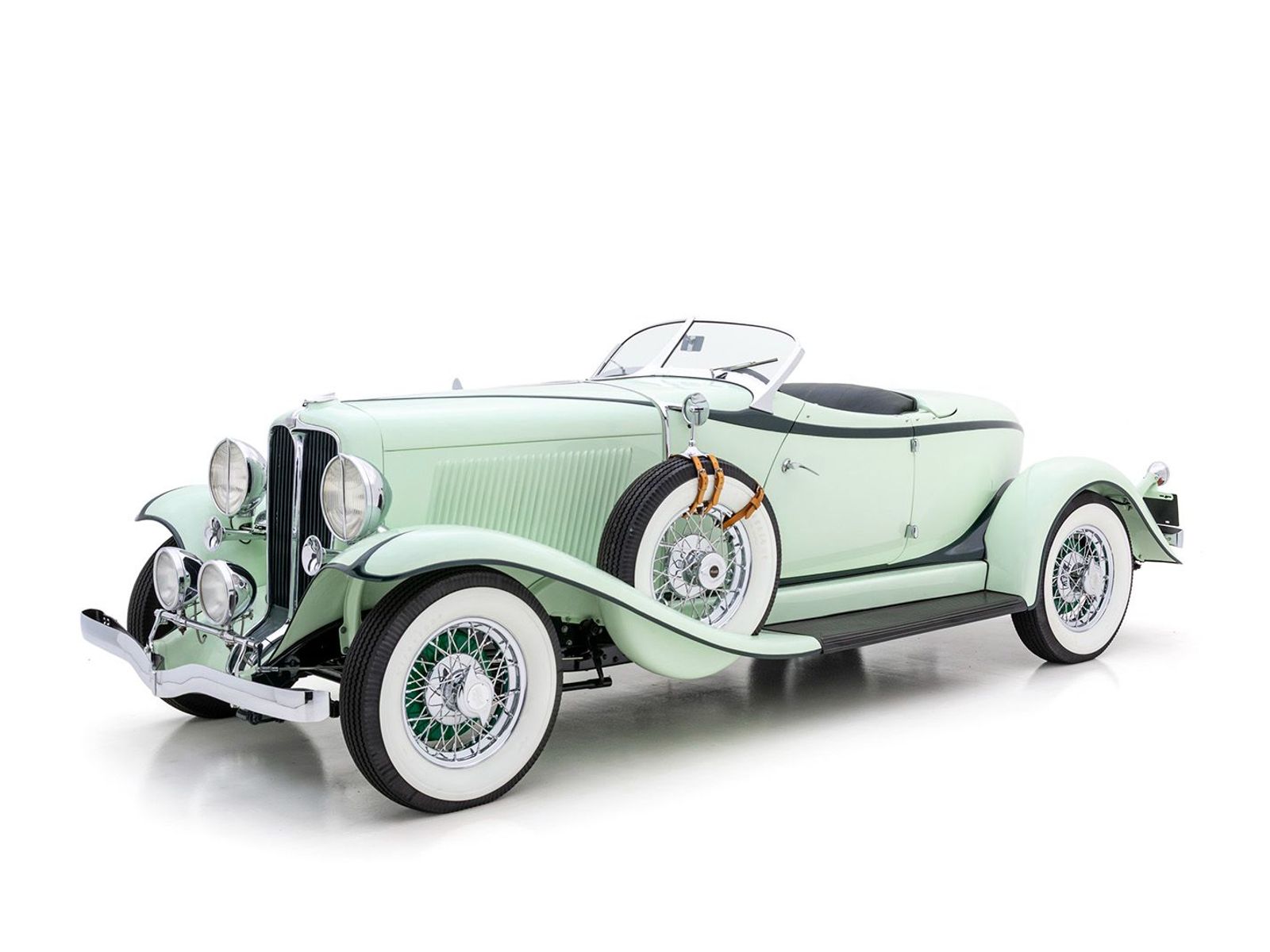 Our featured 1931 Auburn 8-98 Speedster is a beautifully presented example, wearing an accurately crafted boattail Speedster body constructed in steel atop a genuine 1931 Auburn chassis. It is finished in an opulent two-tone livery of mint green with sweeping hunter green accentsan eye-catching combination that complements the cars dramatic lines. While the color scheme makes a bold first impression, the real beauty lies in the finer details: a sharply raked windscreen, dramatic bonnet louvers, and the unmistakable boattail rear end that captures the essence of motion, even at rest.