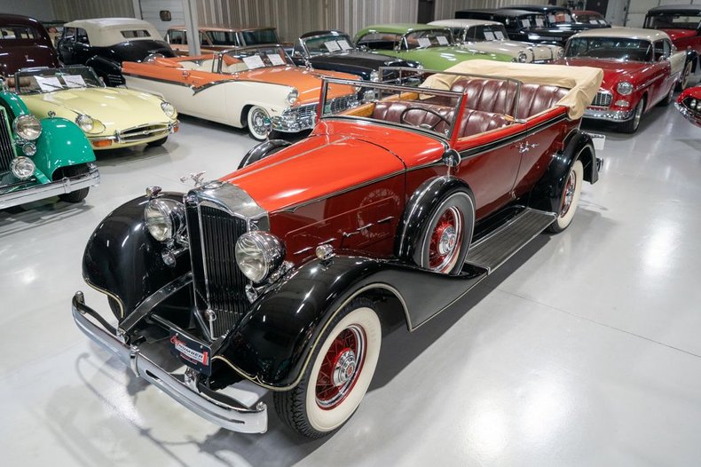 This 1934 Packard Eight Convertible Sedan is the beneficiary of an older restoration and is ready to be driven all summer long! When the first Packard was completed on November 6, 1899, the goal was to create a better automobile than a Winton motor carriage. Just a few short years later, the Packard Motor Companys slogan became Ask the man who owns one which would become the company famous tagline in the decades that followed. As the years went on, Packard became synonymous with luxury and quality, and the company cemented itself atop Americas automotive hierarchy, alongside the likes of Cadillac, Marmon, Stutz, Auburn-Cord-Duesenberg, Peerless, and Pierce-Arrow. When the stock market crashed in the fall of 1929, the demand for luxury cars crashed too putting Peerless and Marmon out of business, Stutz, Pierce-Arrow, and Auburn-Cord-Duesenberg on the brink of failure, and immense financial pressure on those who survived, including Packard. By 1933, the market began to recover and Packard turned its first profit since the start of the Great Depression. Due to its success in 33, Packards leadership predicted, albeit incorrectly, that the worst was behind them and the company released 55 different body styles in its 11th Series cars for the 1934 model year. Ultimately, the Packard Motor Companys sales and production figures fell in 1934 to lows not seen since the early Twenties. Nonetheless, the 1934 Packards are widely considered some of the most elegantly designed cars ever produced by the independent American automaker and therefore have been highly collectible for decades. In fact, the Classic Car Club of America considers the 1934 Packard Eight as a True Classic and they can participate in CCCA events. Design changes in 1934 included longer fenders, redesigned slotted bumpers, and a relocated gas filler cap located behind left rear taillight assembly. Additionally, the tilt windshield from 1933 was replaced with a fixed windshield with an angled vent wing in 1934. In total, only 5,120 Packard Eights were produced in 1934 which makes this Convertible Sedan an especially rare automobile. This particular 1934 Packard Eight comes to us from a prominent Texas collector who owned this car and oversaw its restoration a number of years ago. Under the hood on this 34 Packard Convertible is the famous Packard 320 Cubic Inch L-Head Inline 8 cylinder engine paired with a Stromberg single 2 barrel carburetor that was said to have created 145 horsepower when new. The 320 Straight 8 is backed by a 3 speed manual transmission that is shifted using a floor mounted shifter. This 1934 Packard Convertible rides on a set of wide whitewall bias-ply tires on wire wheels with Packard Eight cloisonn hubcaps that give this True Classic a truly iconic look. Braking is provided by vacuum-assisted mechanical brakes in all four corners which was quite the novelty back in 1934. A pair of side-mounted spare tires are tucked beneath decorative sidemount covers with side-view mirrors which was one of the few options available on the 11th Series Packards. Sitting atop the rear mounted luggage rack is a period-correct trunk so that you can travel with all of your belongings in style. The manually operated beige cloth convertible top is in wonderful condition and is tucked under a matching boot cover when down. All four crank up windows, and the crank up glass divider window, are in excellent condition and work great. The body on this 1934 Packard Convertible Sedan has been refinished in a beautiful period correct tri-tone paint scheme consisting of Ascot Maroon with a Black beltline with Tan accent striping and the fenders were refinished in Black with matching Tan striping. The interior on this 1934 Packard Eight Convertible is gorgeous! The front and rear bench seats have been reupholstered in Burgundy tufted leather that gives this Convertible Sedan a truly luxurious look and feel. The matching burgundy door panels with burl