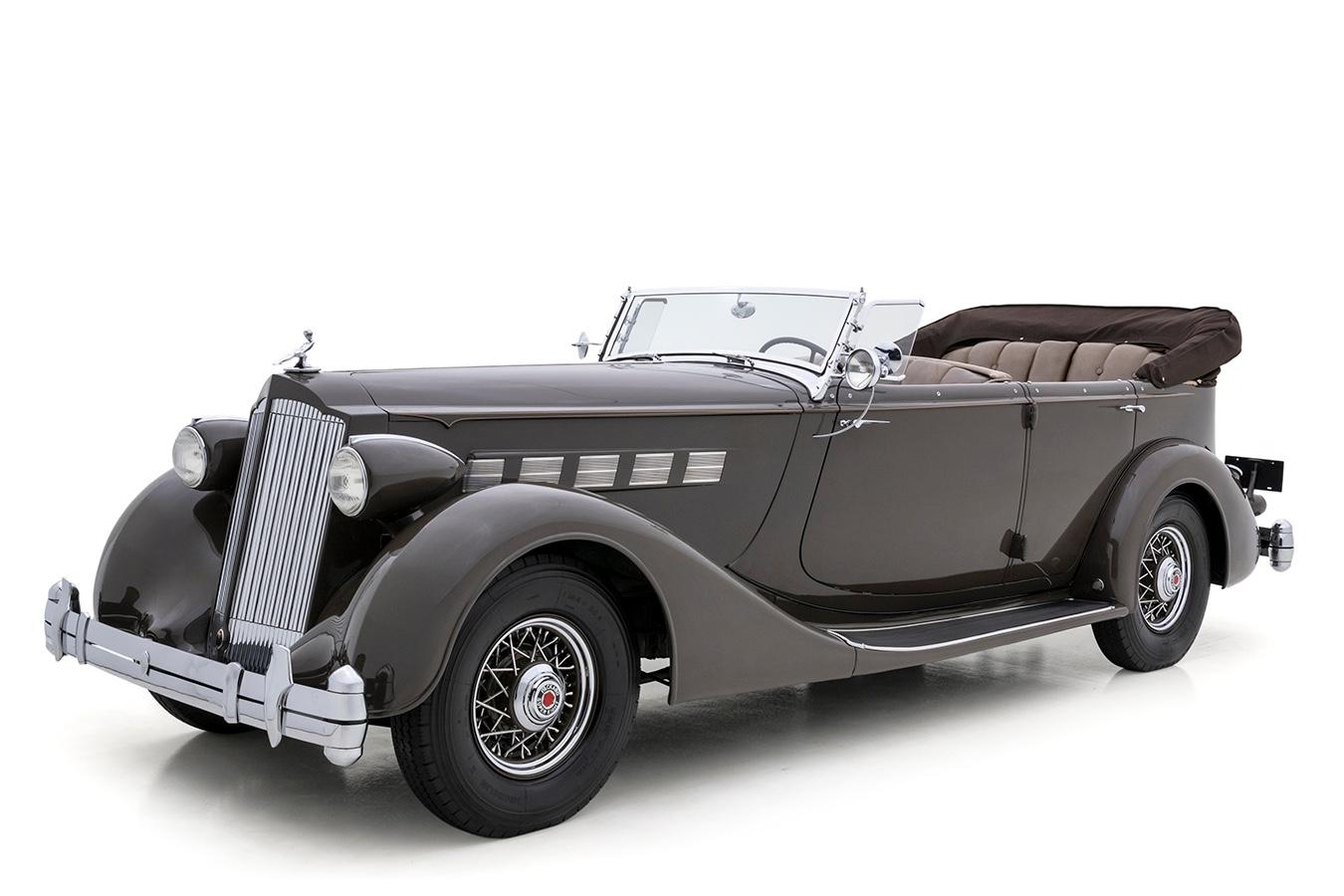This lovely 1936 Packard is a rare and eminently desirable Super Eight clothed in Deitrichs marvelous Convertible Phaeton coachwork. In Packard-speak, this Model 1404-951 is believed to be the 5th Dietrich Phaeton produced, with a sequence number of 205, the firewall tag showing it was delivered new to Boston, Massachusetts on May 9, 1936. Of particular note is this cars lack of side-mount spares, a rarely seen option which emphasizes the gorgeous flowing fender lines, the graceful sweep of the hood-to-cowl shut line, and the sheer scale of its 139-inch wheelbase chassis. Combined with the steeply raked windscreen and low roofline, this is one beautiful automobile.