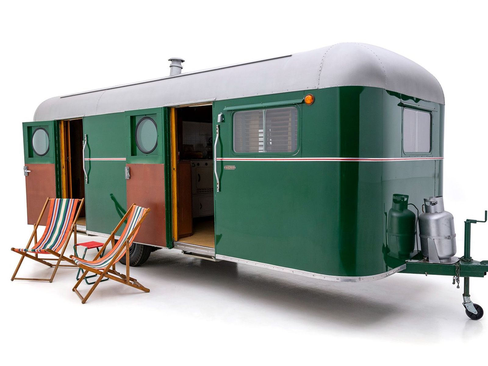 Inside, the Tradewinds boasts a cozy and functional layout, maximizing its compact footprint for comfortable living. A front lounge area doubles as a sleeping space, with built-in storage compartments and foldaway furnishings that optimize usability. The kitchenette is equipped with a gas stove, an icebox, and a stainless-steel sink, catering to the needs of travelers who preferred self-sufficiency on the open road. A small yet efficient dinette provides a space for meals, while large windows and roof vents ensure ample ventilation and natural light.
