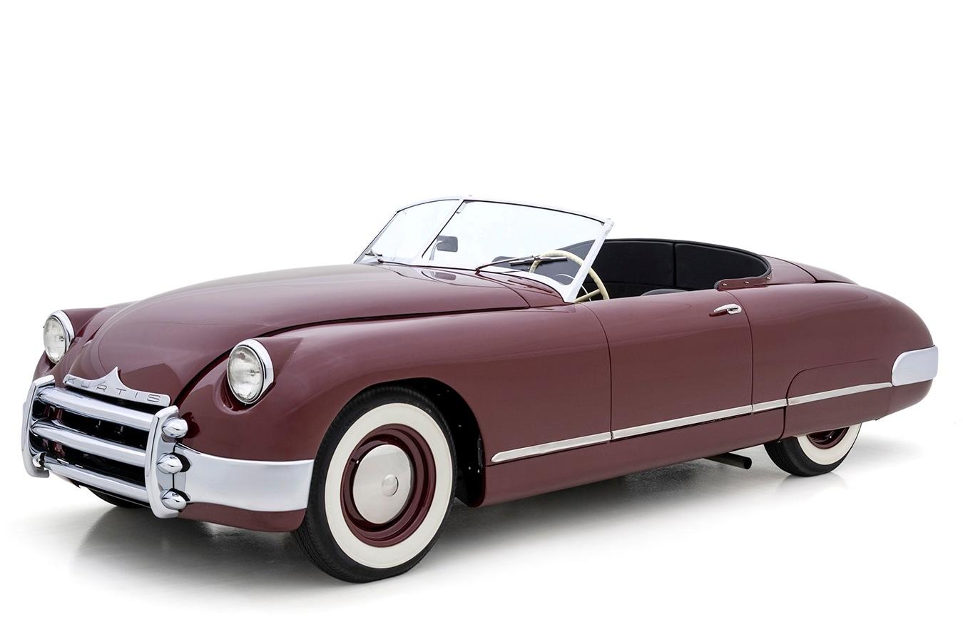 Finished in a deep maroon over black leather, the car is initially staid in appearance, but a closer look reveals the sportiness of the Kurtis. Chrome wheel covers, an ivory steering wheel, and whitewall tires add style and flair to the motorcar, while the brightwork remains in excellent condition. The raked, V-windshield adds to the sporting appeal.