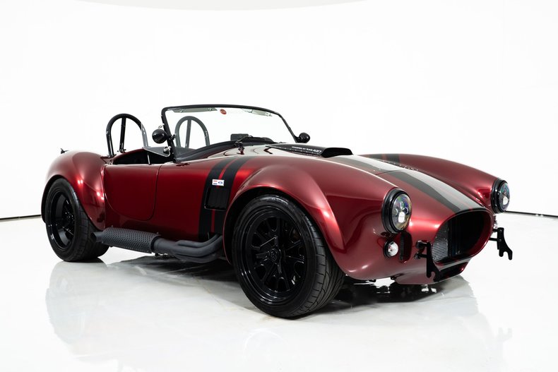 This 1965 Backdraft Cobra for sale has a 427 Windsor V8480 HP, TKX 5-Speed Manual Transmission, Ford Super 8.8 Rear End with 3.55 Gears, Ruby Flare Red with Black Magic Stripes & Gloss Blackout Pkg., Black Leather Interior with Sabelt Suede Wheel, Optional Heater, Glovebox, Driver & Passenger Side Mirrors, LED Lights, Ceramic Coated Headers, Dual Roll Bars and Tonneau Cover for Cockpit, One Owner with 5,390 Miles, Nicely Equipped 427 Cobra Ready for Street or Track!