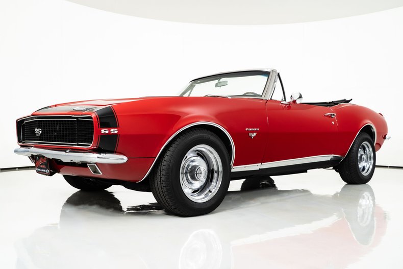 This 1967 Chevrolet Camaro RS/SS Convertible for sale has a 350 V8 BluePrint Crate Engine (386 HP), Headers & Holley 4 Barrel Carburetor, 4-Speed Manual M21 Transmission, Red Exterior with a Black Convertible Top, Black Vinyl Deluxe Interior, Bucket Seats & Center Console, Power Windows , Air Conditioning, Power Steering & Power 4-Wheel Disc Brakes, 15 Chrome Rally Wheels with Radial Tires, Wood Rimmed Steering Wheel & Auxiliary Gauges, Documented Maintenance going back to 2003!