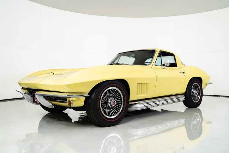 This 1967 Chevrolet Corvette Coupe for sale has a L79 327-350 HP - Numbers Matching V8, 4-Speed Muncie M20 - Numbers Matching, 3.36 Rear Gears w/ Limited Slip, Sunfire Yellow Exterior with Side Exhaust, Black Vinyl Interior, Telescopic Steering Wheel, AM/FM Radio, Power 4-Wheel Disc Brakes, Power Steering, Original Tank Sticker, Protect-o-Plate, and Owners Manual Included, Aluminum Bolt-on Wheels with New Redline Radials, A Well Optioned Coupe with Tank Sticker to Prove it!!!