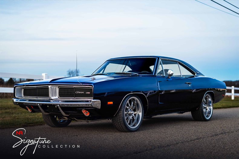 No Reserve Classics is proud to present to you our 1969 Dodge Charger 383 Restomod! The Dodge Charger is one of the most popular muscle cars ever built. This 1969 Charger is embraced with a timeless and aggressive appearance along with having a rare opportunity to acquire a true west coast Arizona Mopar in this condition. Being a dry west coast car for its entire life, it was able to retain the factory metal and stampings found around the car. Painted in Kona Blue pearl with a Black Vinyl Top. Under the scalloped hood, numbers matching Mopar 383 Big Block engine along with the correct Torqueflite 727 automatic transmission. Under the hood, more factory stampings appear, down to the Chrysler stamping on the original radiator. With Vintage Air Conditioning and Heating, Electronic Choke, Power Steering, and Power Front Disc Brakes, this Charger is ready to ROLL! The interior has been restored with a new carpet and a fully restored dash. It still has the original dash gauges with an astonishingly low number of miles at only 73,685 original miles. The radio was upgraded to a factory-appearing Retrosound radio for a more modern sound. And because it lived in the dry West Coast climate of Arizona, the underbody is just as solid as it is the top with multiple new bushings and shocks as well! The sale of this Charger also includes the original, rebuilt factory radio along with the factory speedometer with original miles. Before lifting up the factory scallop hood, youll notice the working hood-mounted turn signals that still operate today. Once the hood has been lifted the gem appears with a matching numbers Mopar 383 motor. It has been mated up to its factory correct 727 Torqueflite automatic transmission. With a recent renovation done to the entire engine bay, it appears as if this Charger just came out of the dealership in 1969 in Hammerock, Michigan. The two-barrel carburetor is mounted on its factory aluminum intake manifold, but not before it goes through a billet aluminum air induction system that matches the finned Mopar performance valve covers. Multiple stampings can also be found throughout the engine bay including the factory 26-inch radiator and the factory exhaust manifold. And just because this Charger was built to have fun doesnt mean that we couldnt give it a dash of modern amenities with a Vintage air conditioning system that has been added to its already impressive options such as power steering, power assist brakes, and even electronic choke! The exterior has been painted in Kona Blue Pearl paint with a Black Vinyl Top. All of the chrome on this Charger has been recently restored giving it a shiny and brand-new appearance. Scrolling along the straight body lines, your eyes immediately are drawn to the brand-new two-tone wheels that have just been installed. The front wheel is 18 inches and is surrounded by a brand-new Continental Extreme Contact 245/40/18 tire. In the rear is a massive 295mm wide tire with an even wider 10 wide rim attached. Gazing at the wheels you might skip over the factory-scalloped doors, chrome wheel well moldings, or even the factory-optioned left-hand outside mirror. Overall a very factory-correct exterior with all of the factory metals still attached. As always, if youre an extremely interested buyer and are not quite yet convinced about the condition of our vehicle, we not only welcome inspections but we encourage them! Please feel free to set up an appointment with any credible inspector and well be more than happy to put this car up on a lift for a thorough comprehensive inspection! The sale of this 1969 Dodge Charger Restomod also includes a service contract available for purchase! Classic Car Financing is also available through any of our recommended financing par