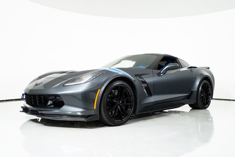 This 2017 Chevrolet Corvette Grand Sport 3LT Collectors Edition for sale has a 6.2 Liter V8 with Dry Sump Oiling System, 460HP/465 TQ, 8L90 Eight-Speed Automatic Transmission, Electronic Limited Slip & Rear Axle Cooler, Watkins Glen Gray Metallic w/ Blue Accents & Carbon Roof, GT1 Bucket Seats, Tension Blue Interior w/ Gray Inserts, Heated and Ventilated Seats, Heads Up Display, Transmission Cooler, Brembo Brakes & AWE Performance Exhaust, Under 24,000 Miles, C7 Grand Sport Collectors Edition in Watkins Glen Gray !